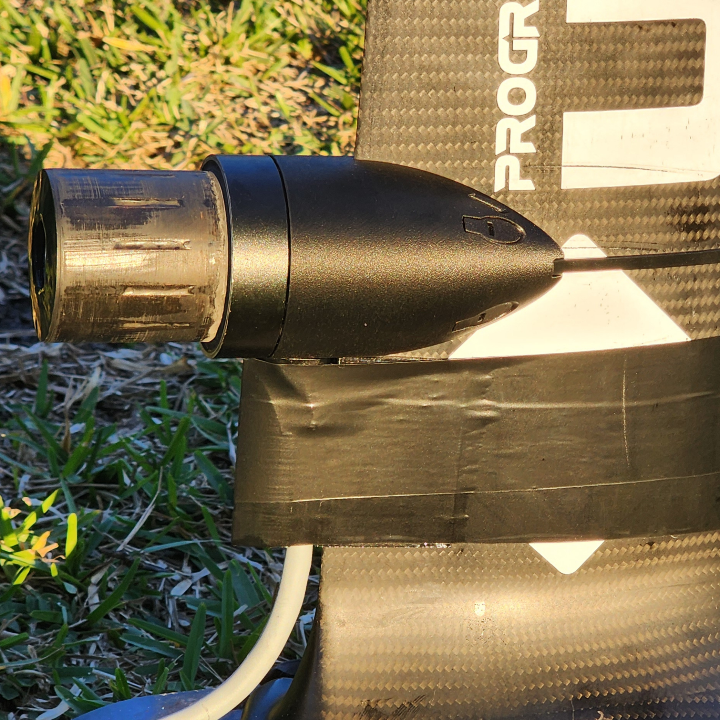 - Usage of the Zip-pod with longer cable lengths (such as e-foil positons) are at your own risk and not guaranteed to fit well. Some masts (like aluminum extrusion) and some carbon ones have a constant cross section from one end to the other, so they would work along the whole length. Other masts taper (reduce size) in the chord length and/or width direction and the Zip-Pod will not fit tight to the mast and could cause vibrations or damage. It might be feasible to use extra wraps of tape to fill the gap, but good, snug fitment can not be guaranteed and usage is at your own risk. You would also need to purchase extra cable fairings (LINK) to reach to the final motor position for a clean cable-tape installation.